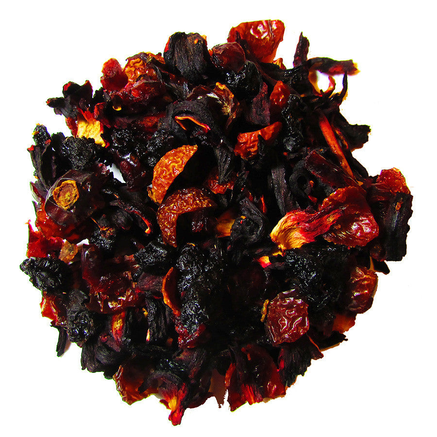 Sweet and Tangy. This blend of cherry, elderberry, rose hips, hibiscus, cranberry, blackberry, and raspberry, is guaranteed to make your taste buds jump! This tea gives off an alluring ruby-red color filled with a tangy, tart, and subtle hints of sweet flavor! Naturally decaffeinated.